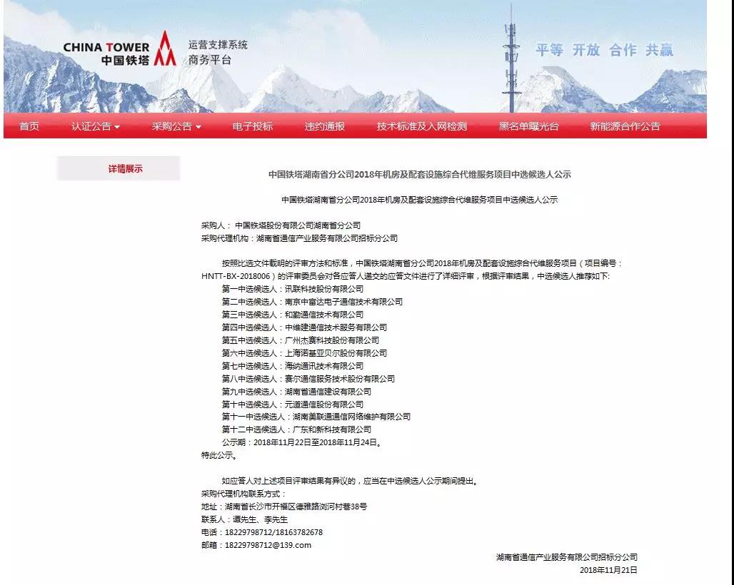 《中國鐵塔湖南省分公司2018年機房及配套設施綜合代維服務》項目于2018年11月20日在湖南長沙開標,經評標委員會及專家評審,航天通信所屬南京中富達在眾多競爭對手中脫穎而出,中標第二份額標包。此次標的為2019年至2021年中國鐵塔湖南分公司機房及配套項目綜合代維服務,為期三年。