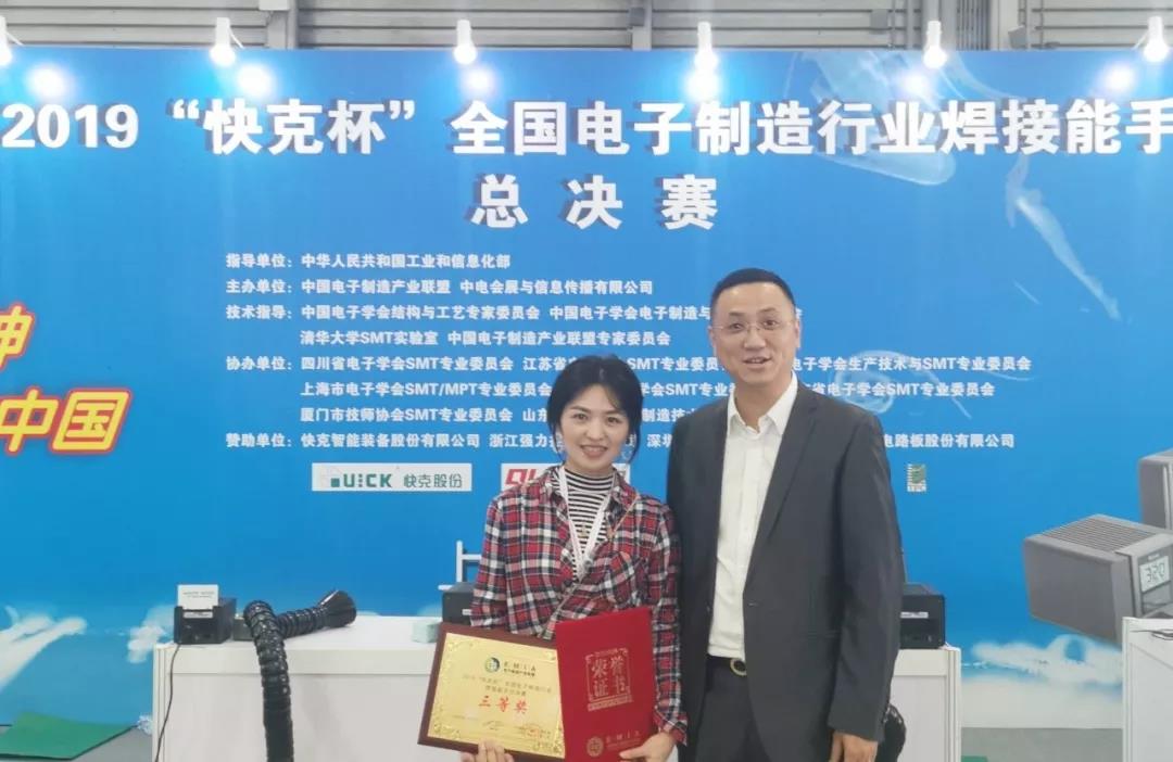 日前,2019年“快克杯”全國電子制造行業焊接能手總決賽在上海新國際博覽中心舉辦。成都航天電子裝調事業部侯本麗同志榮獲季軍。