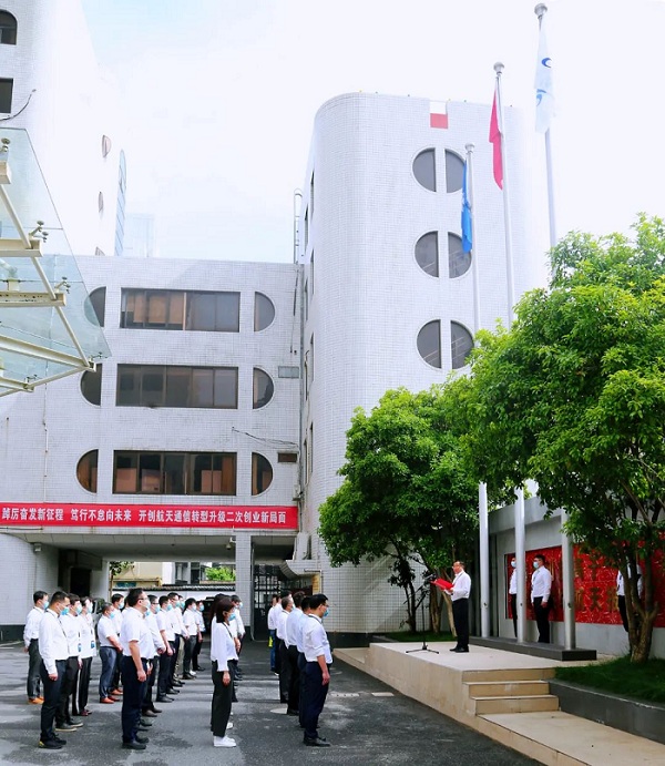 為慶祝第七個(gè)“中國航天日”,按照集團(tuán)公司統(tǒng)一部署,2022年4月24日上午,航天通信本部及所屬各單位分別在杭州、成都、沈陽、綿陽、鎮(zhèn)江等地舉行升旗儀式,共同升起“同一面旗幟”。公司黨委書記、董事長張忠榮攜公司本部中層以上領(lǐng)導(dǎo)人員、職工代表在杭州參加公司本部升旗儀式并作動(dòng)員講話。