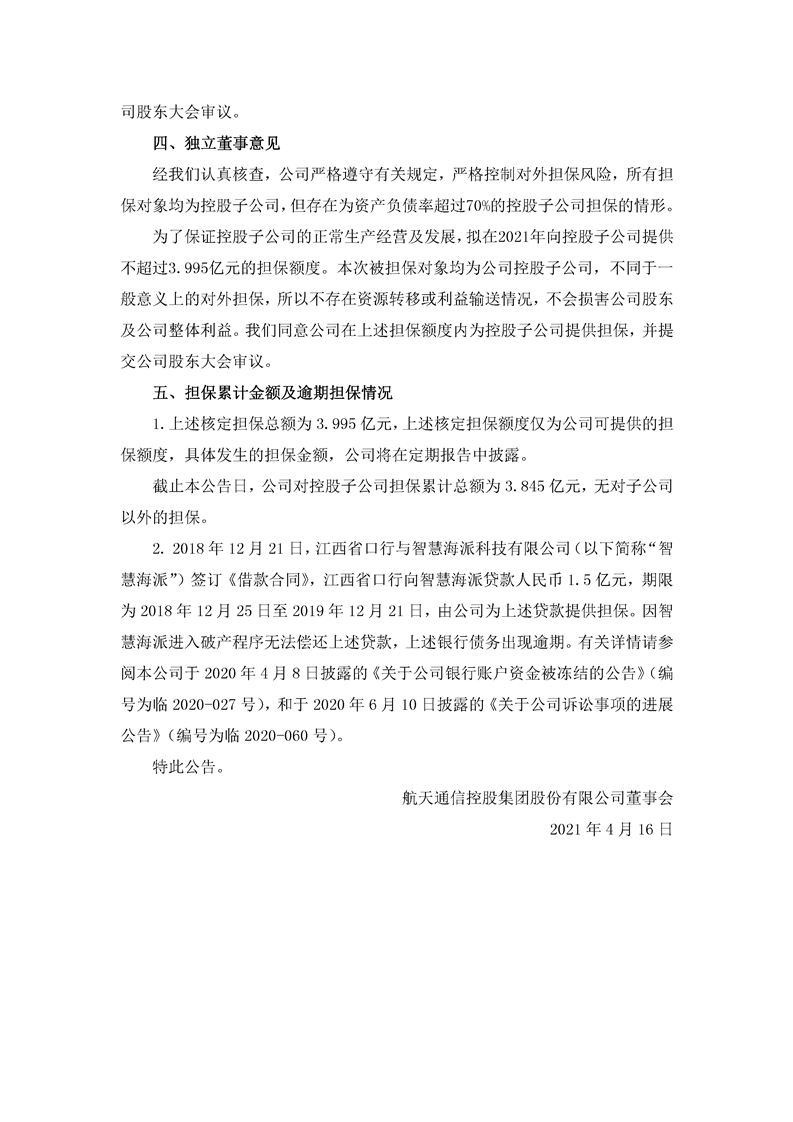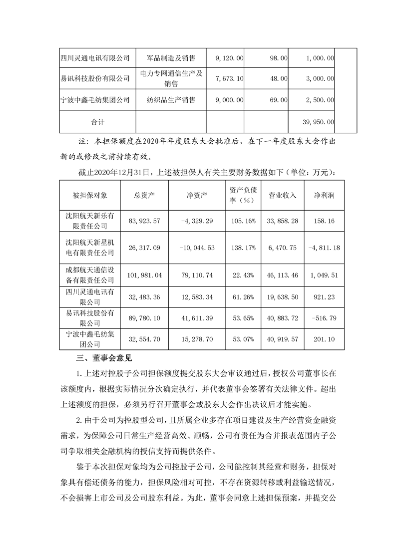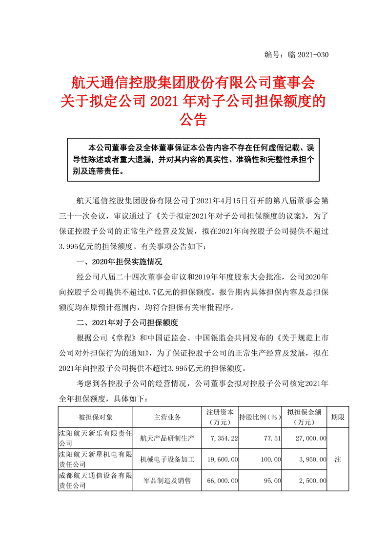 航天通信控股集團(tuán)股份有限公司關(guān)于擬定公司2021年對子公司擔(dān)保額度的公告