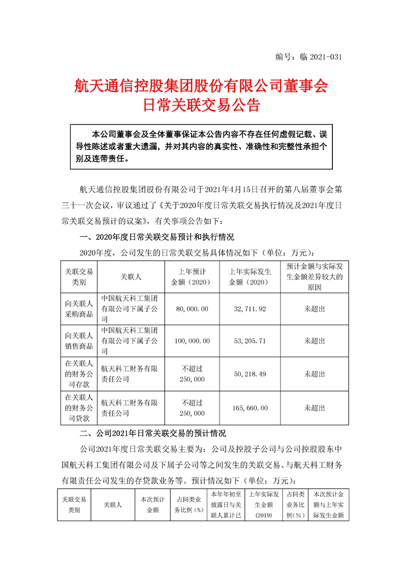 航天通信控股集團(tuán)股份有限公司日常關(guān)聯(lián)交易公告