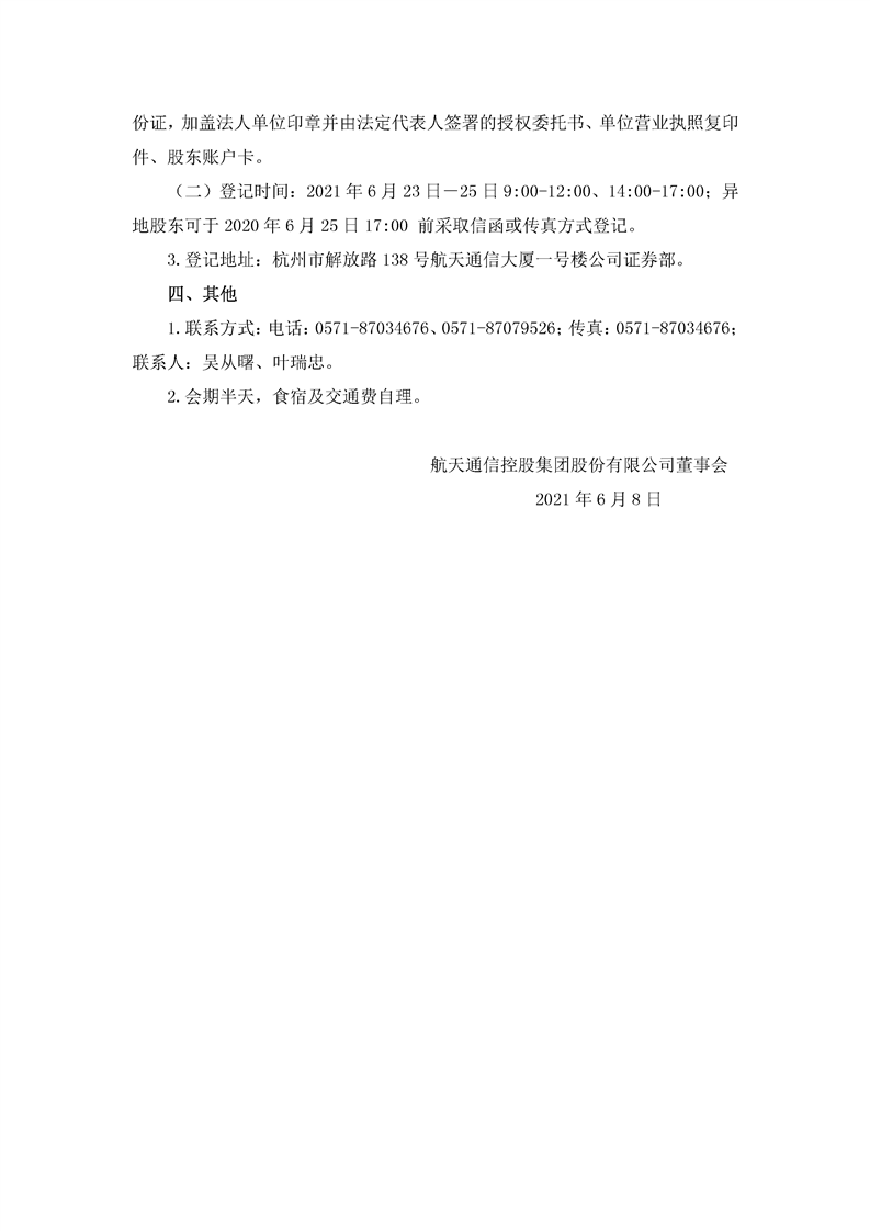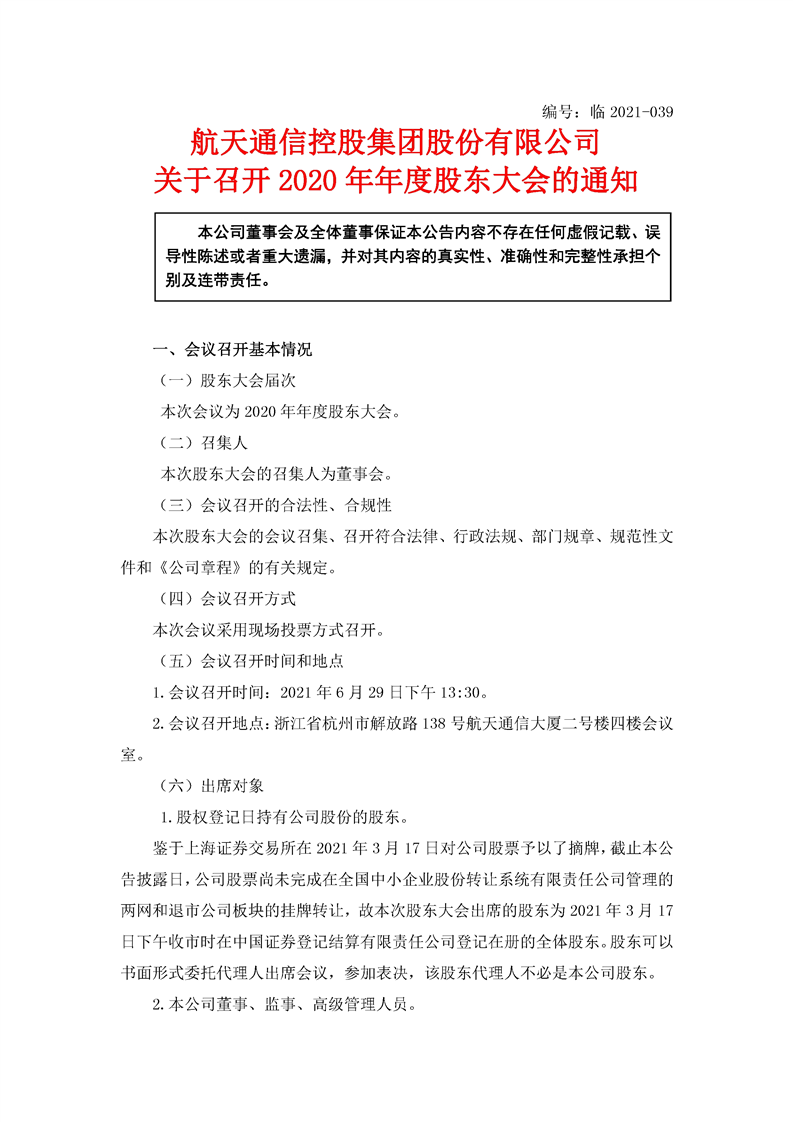 航天通信控股集團(tuán)股份有限公司關(guān)于召開2020年年度股東大會(huì)的通知
