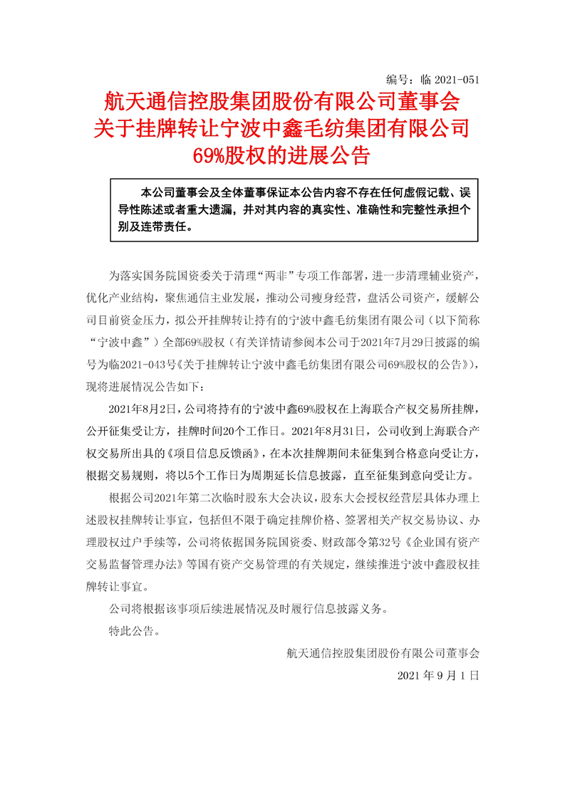 航天通信控股集團股份有限公司關于掛牌轉讓寧波中鑫毛紡集團有限公司69%股權的進展公告